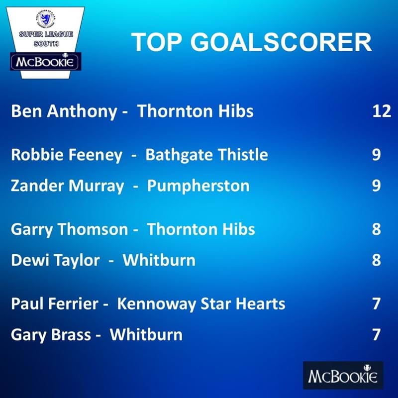 Ben Anthony of Thornton Hibs is the top scorer in the Super League South with 12 goals, three ahead of Bathgate's Robbie Feeney and Pumpherston's Zander Murray. On eight goals is Anthony's Hibs team mate Garry Thomson and Whitburn's Dewi Taylor then a goal further back on seven is Kennoway Star Hearts Paul Ferrier and Whitburn's Gary Brass