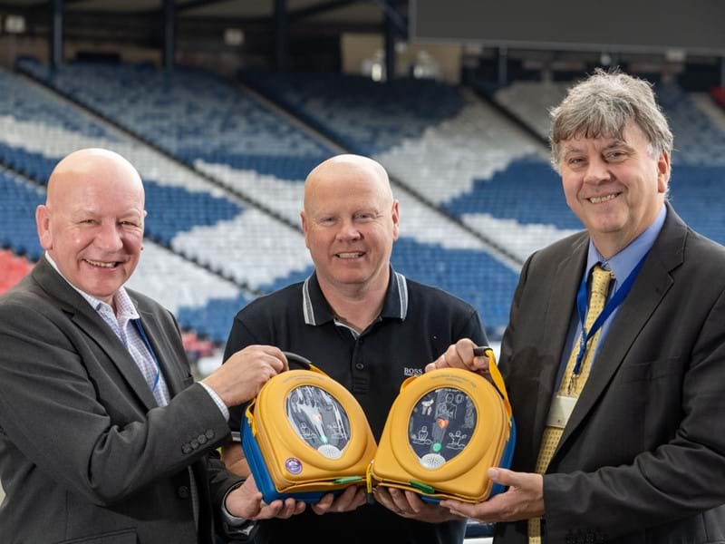 Pictured are : from left, St Andrew's First Aid Jim Dorman (Director of Operations and Community Engagement) with Alex McDowall (SJFA) and Stuart Callison (Chief Executive) at Hampden Stadium.
